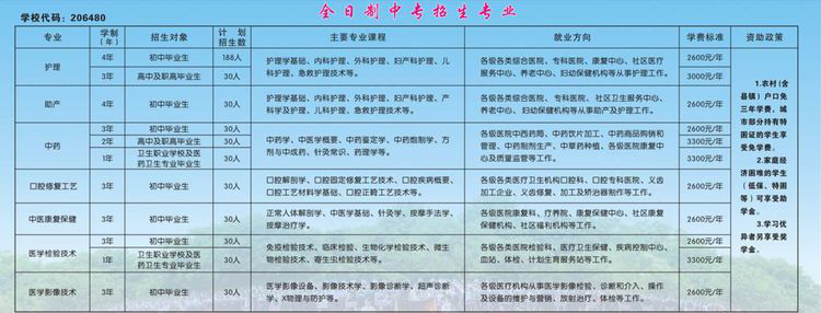 招生信息 学校开设全日制中专护理、助产、中药、中医康复保健、口腔修复工艺、医学检验技术、医学影像技术等专业。