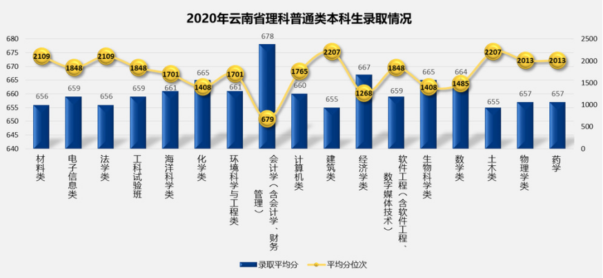 2.2020年云南省普通批次分专业录取平均分及平均分对应位次情况: