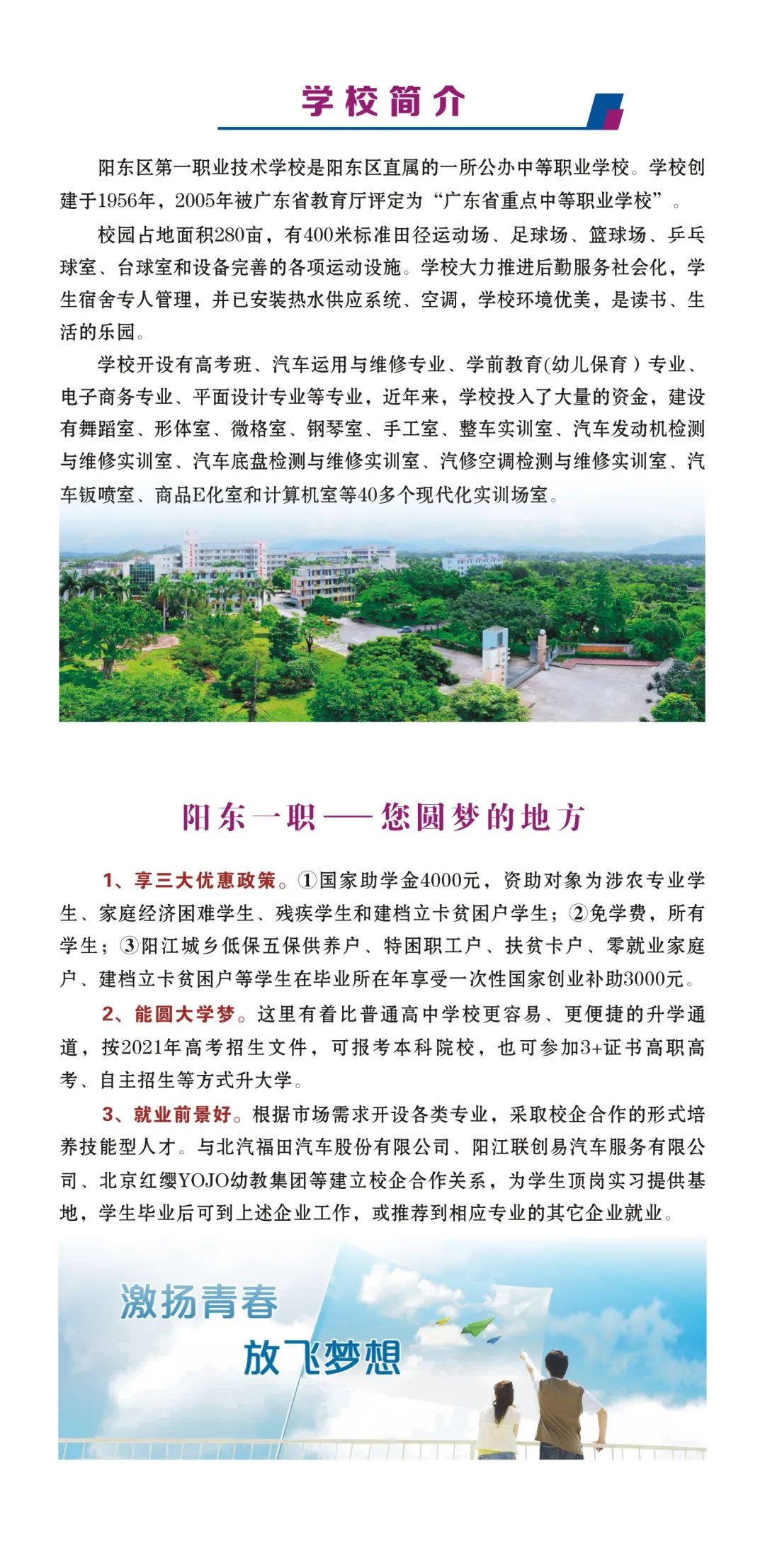 3、就业前景好。根据市场需求开设各类专业,采取校企合作的形式培养技能型人才。与北汽福田汽车股份有限公司、阳江联创易汽车服务有限公司、北京红缨YOJO幼教集团等建立校企合作关系,为学生顶岗实习提供基地,学生毕业后可到上述企业工作,或推荐到相应专业的其它企业就业。