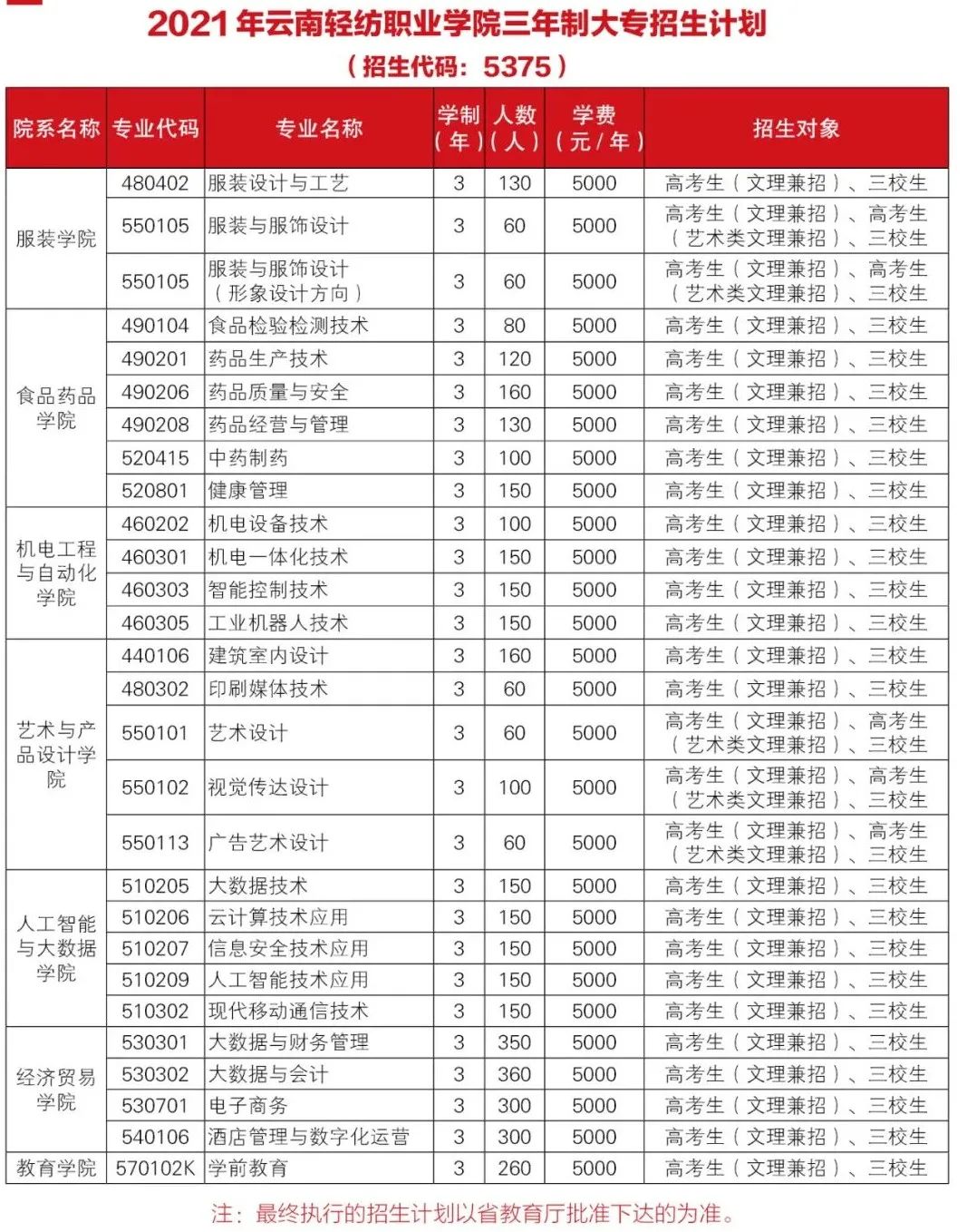 | 550102 | 视觉传达设计 | 3 | 100 | 5000 | 高考生(文理兼招)、高考生 (艺术类文理兼招)、三校生 |