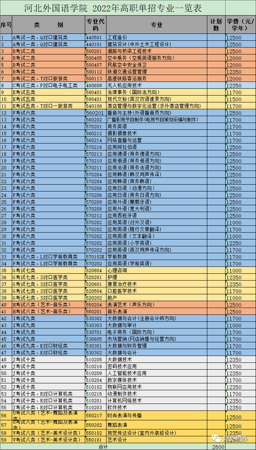 2022年,河北外国语学院单招共涉及9大类、59个专业、2600个计划,欢迎广大考生报考河北外国语学院。在填报志愿时,把河北外国语学院作为第一志愿填报,录取率最高可达99%。