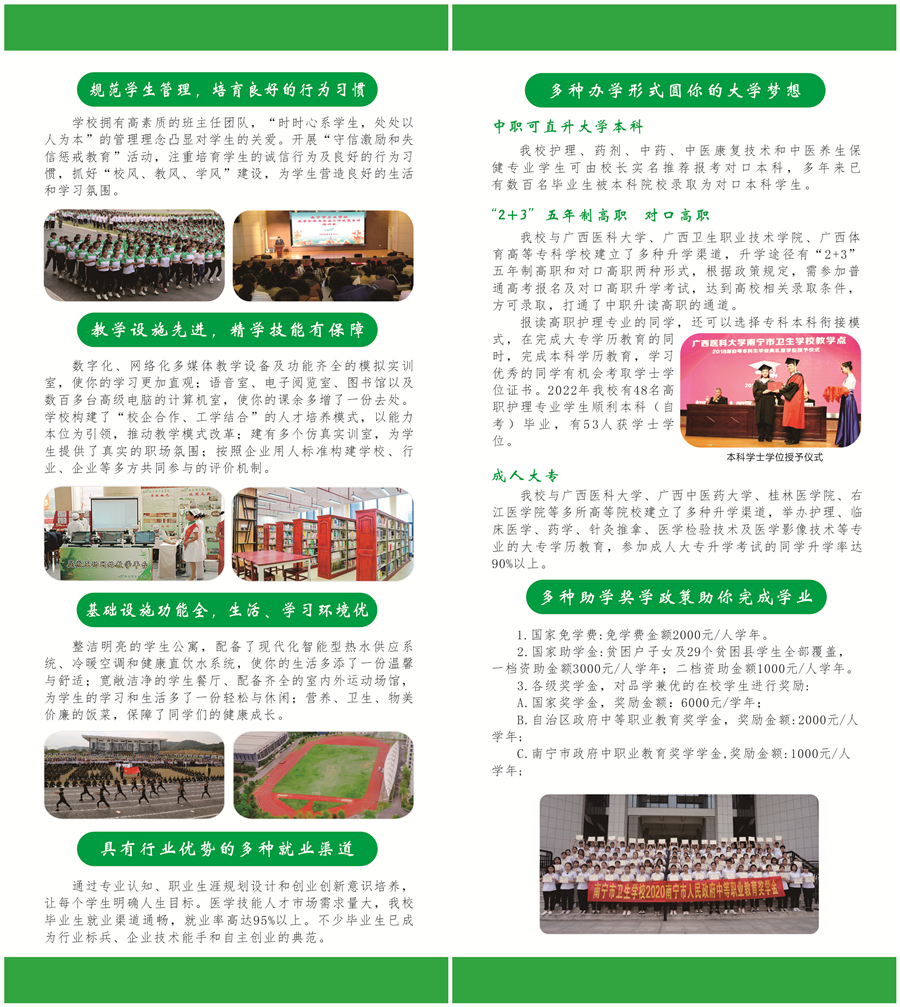 我校护理、药剂、中药、中医康复技术和中医养生保健专业学生可由校长实名推荐报考对口本科,多年来已有数百名毕业生被本科院校录取为对口本科学生。“2+3”五年制高职对口高职我校与广西医科大学、广西卫生职业技术学院、广西体育高等专科学校建立了多种升学渠道,升学途径有“2+3”五年制高职和对口高职两种形式,根据政策规定,需参加普通高考报名及对口高职升学考试,达到高校相关录取条件,方可录取,打通了中职升读高职的通道。报读高职护理专业的同学,还可以选择专科本科衔接模式,在完成大专学历教育的同时,完成本科学历教育,学习优秀的同学有机会考取学士学位证书。2022年我校有48名高职护理专业学生顺利本科(自考)毕业,有53人获学士学位。