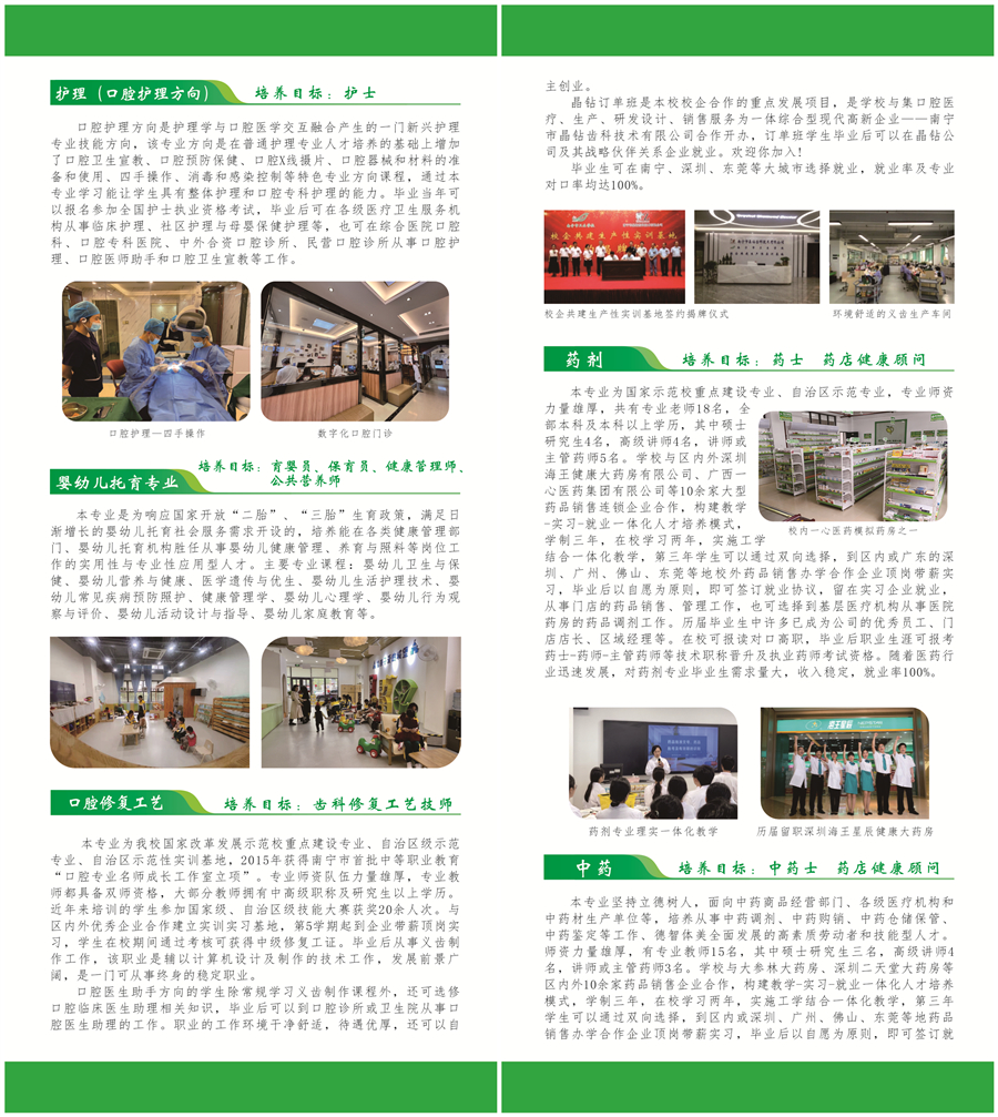 晶钻订单班是本校校企合作的重点发展项目,是学校与集口腔医疗、生产、研发设计、销售服务为一体综合型现代高新企业一一南宁市晶钻齿科技术有限公司合作开办,订单班学生毕业后可以在晶钻公司及其战略伙伴关系企业就业。欢迎你加入!毕业生可在南宁、深圳、东莞等大城市选择就业,就业率及专业对口率均达100%。