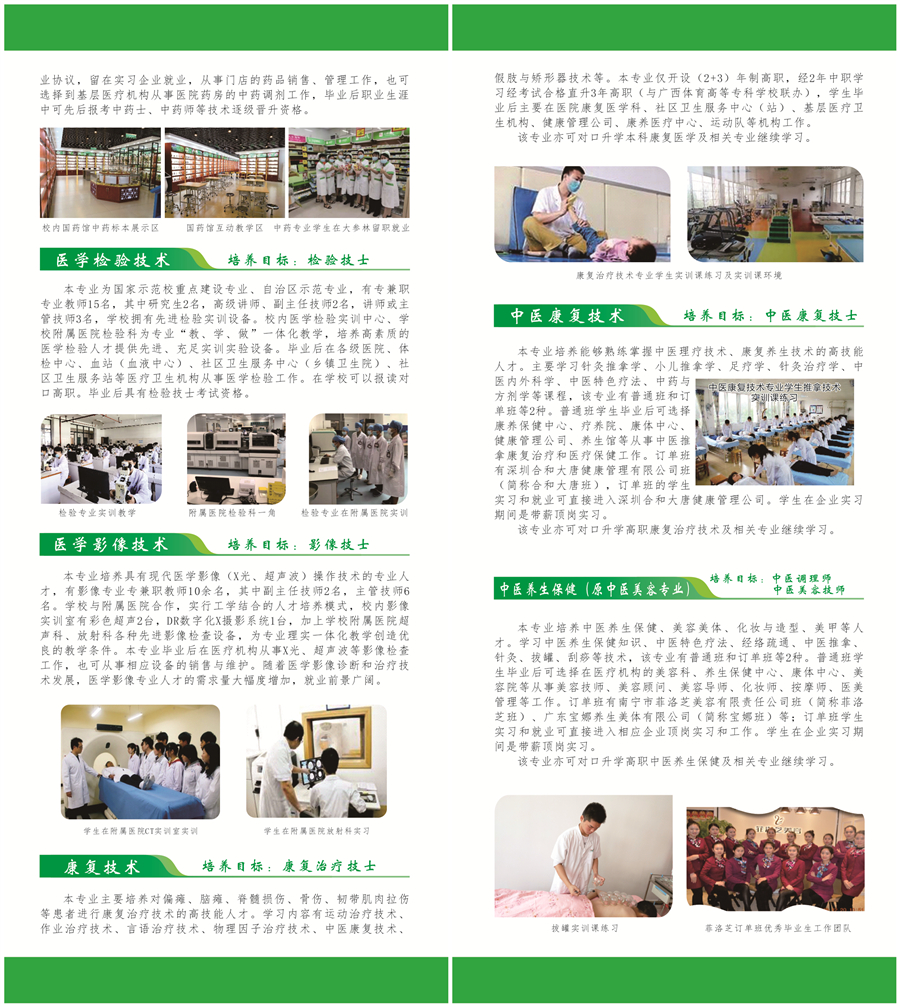 等患者进行康复治疗技术的高技能人才。学习内容有运动治疗技术,作业治疗技术、言语治疗技术、物理因子治疗技术、中医康复技术、假肢与矫形器技术等。本专业仅开设(2+3)年制高职,经2年中职学习经考试合格直升3年高职(与广西体育高等专科学校联办),学生毕业后主要在医院康复医学科、社区卫生服务中心(站)、基层医疗卫生机构、健康管理公司、康养医疗中心、运动队等机构工作。该专业亦可对口升学本科康复医学及相关专业继续学习。