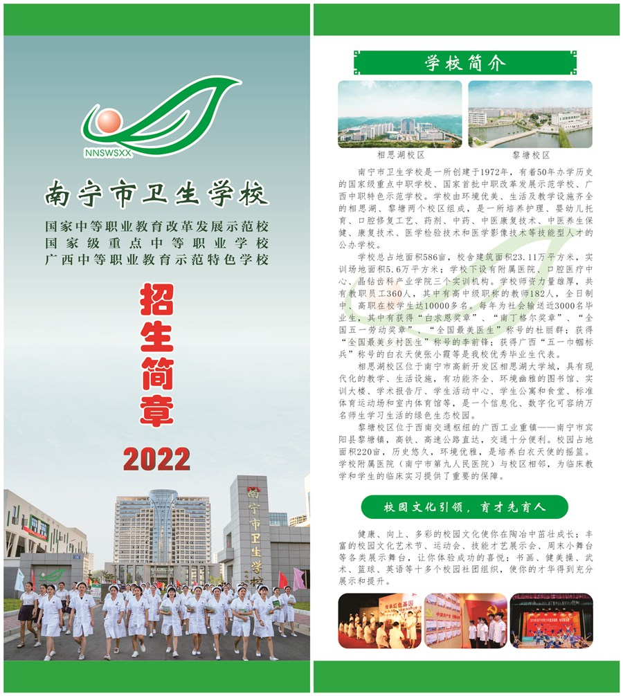 南宁市卫生学校是一所创建于1972年,有着50年办学历史的国家级重点中职学校、国家首批中职改革发展示范学校、广西中职特色示范学校。学校由环境优美、生活及教学设施齐全的相思湖、黎塘两个校区组成,是一所培养护理、婴幼儿托育、口腔修复工艺、药剂、中药、中医康复技术、中医养生保健、康复技术、医学检验技术和医学影像技术等技能型人才的公办学校。