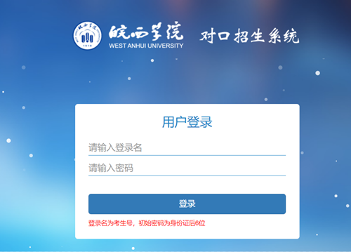 皖西学院对口招生系统网址https://duikou.***.cn/login,请考生使用手机或电脑访问系统。账号为考生号,初始密码为身份证号后6位(含‘X’的为大写)。首次登录后,需修改密码才能进行后续操作。修改后的密码请考生务必牢记,密码连续输错10次以上将会锁定账户,限制登录。可联系管理员重置密码0564-3305004。