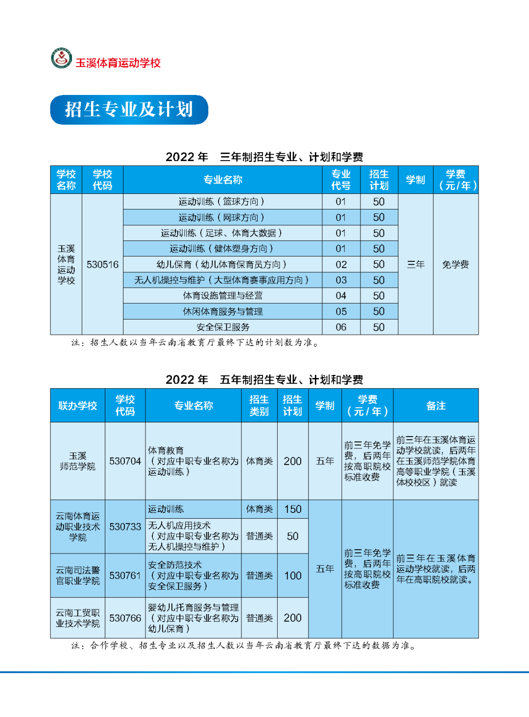 2021年玉溪体育运动学校五年制招生专业、计划和学费